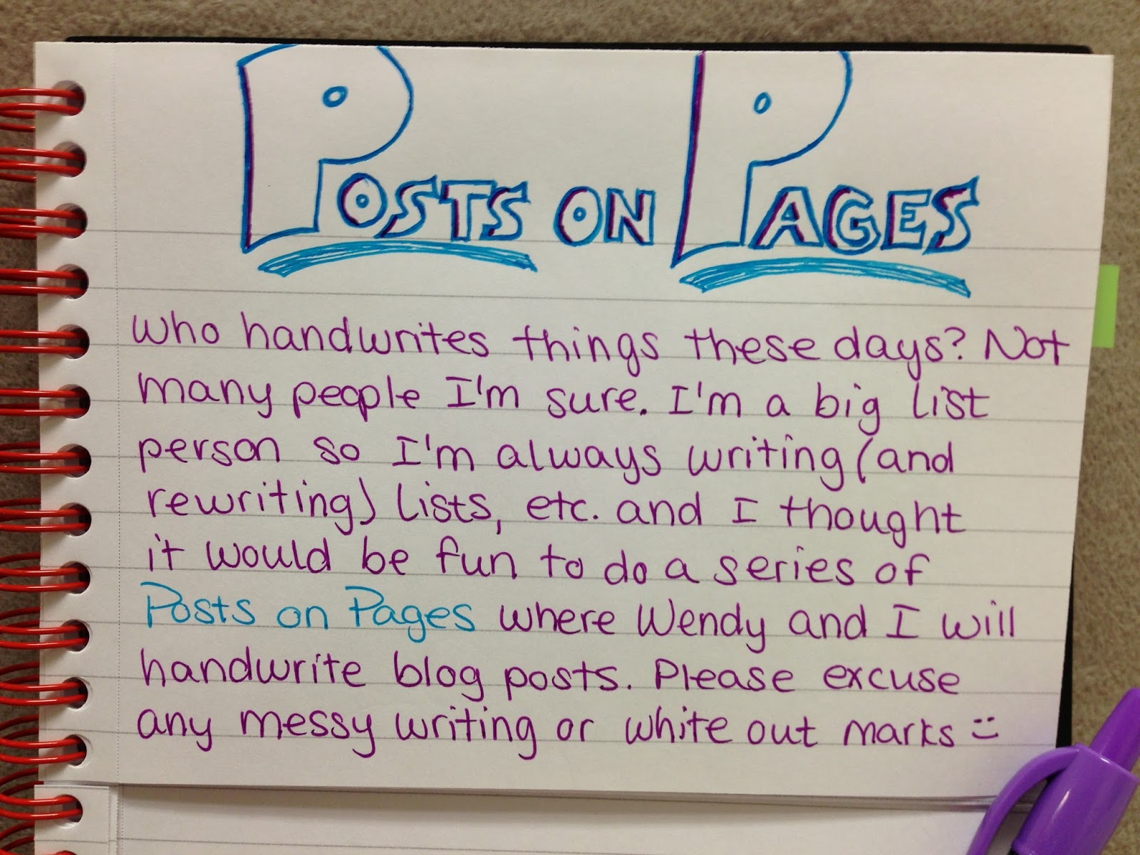 Who handwrites things these days? Not many people I'm sure. I'm a big list person so I'm always writing (and rewriting) lists, etc. and I thought it would be fun to do a series of Posts on Pages where Wendy and I will hand write blog posts. Please excuse any messy writing or white out marks :)